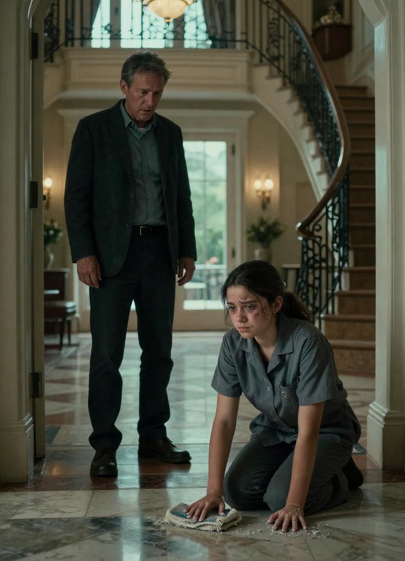 In the grand foyer, a woman in a worn, faded gray uniform knelt scrubbing the cold marble floor near the staircase. Her hands trembled as if weighed down by exhaustion, her posture a stark contrast to the grandeur around her. I opened my mouth to greet her—until she lifted her gaze.