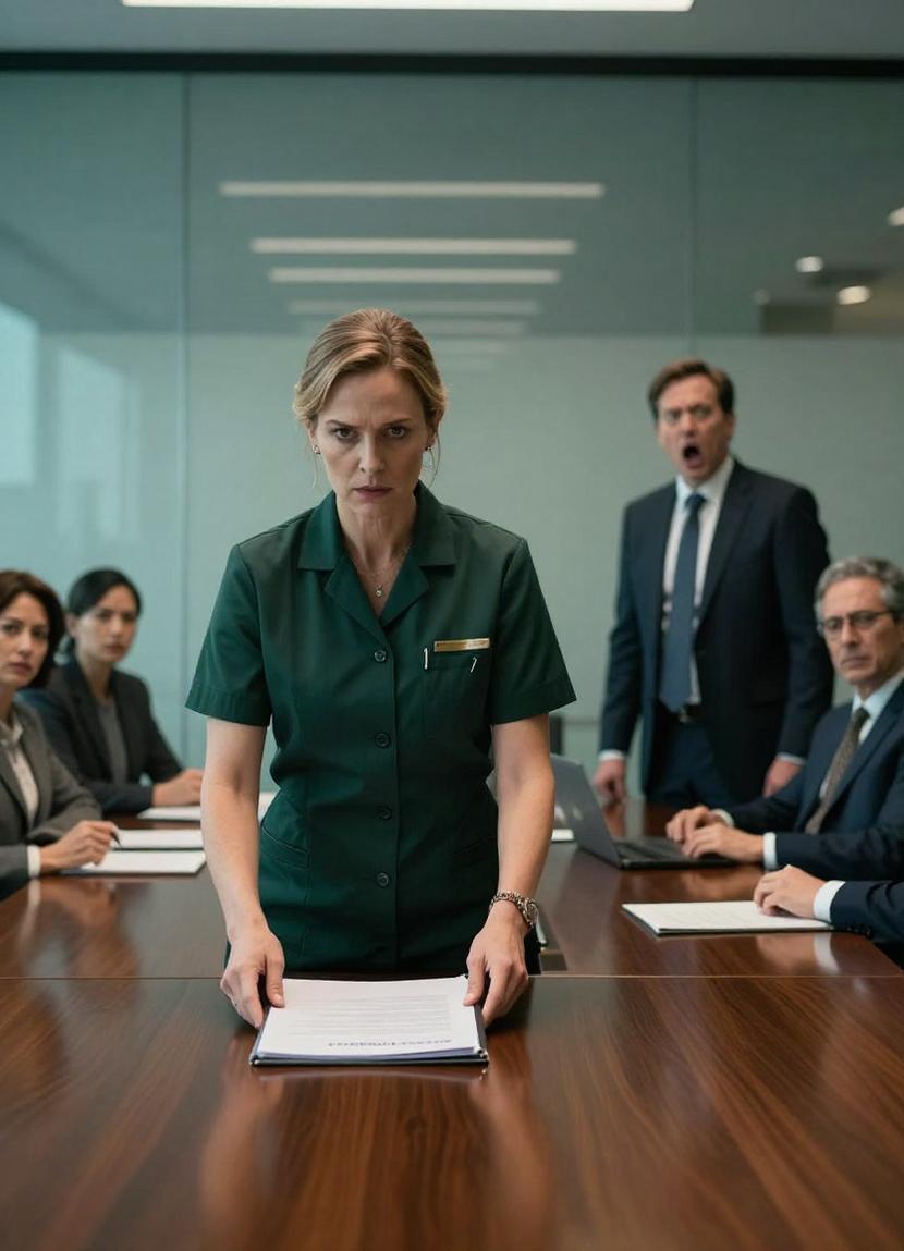 Eyes darted among board members, anticipating her retreat. But Isabella stood tall, dignity radiating through that humble green uniform, transforming her into a queen within these walls.