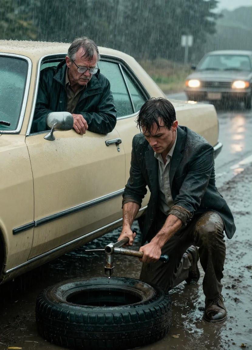 Beside it, a frail old man battled a tire iron, his soaked windbreaker clinging to his shivering frame. Through misted glass in the passenger seat, a woman curled, framed by fear and cold.