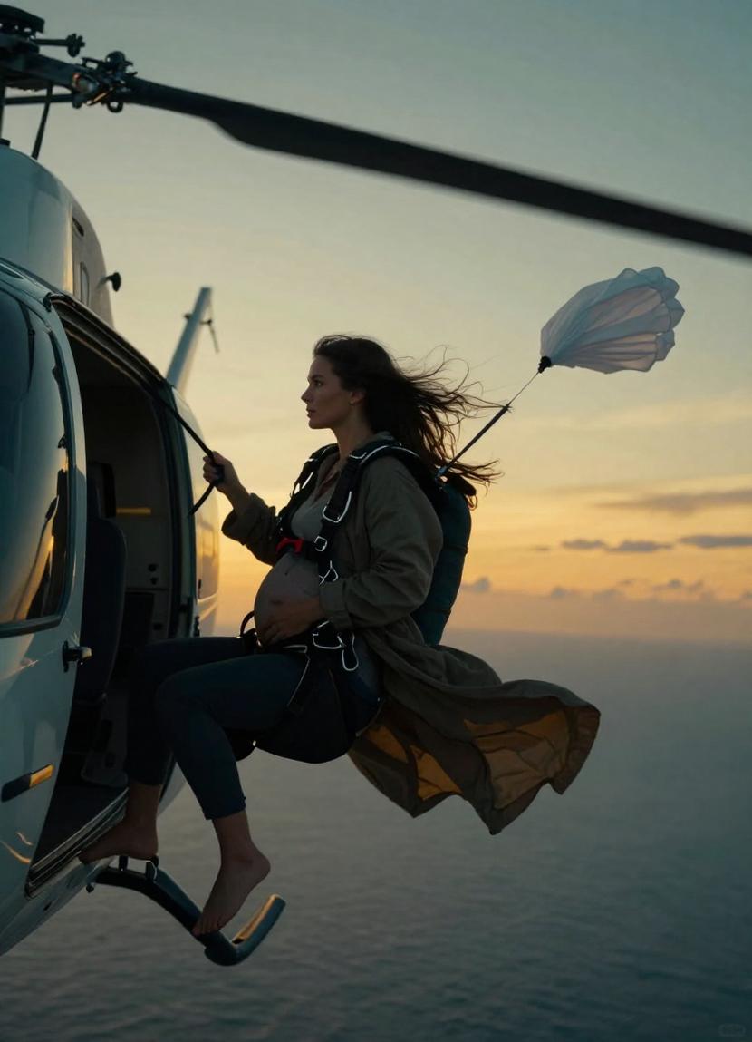 Mid-fall, with startling calm, she secured the harness and yanked the ripcord. The world seemed to hold its breath as the parachute burst open, billowing like a white beacon against the twilight sky, arresting her fall with majestic grace.