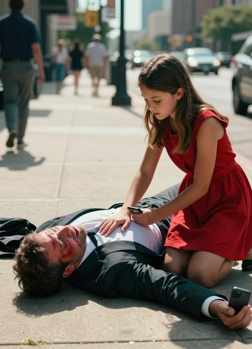 Nearby, a little girl in a vibrant red dress was chasing iridescent butterflies with carefree delight. The sudden, heavy thud of Sebastian’s fall stopped her in her tracks. Instinctively, she raced toward him, her small hand trembling as she pressed gently against his chest. “He’s still breathing,” she murmured, her voice steady despite the urgency.