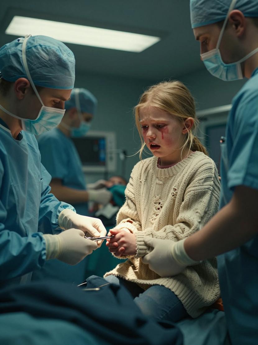 Lying on the stretcher was a little girl, no more than seven. Blonde hair plastered against a pale, nearly translucent face lit by harsh fluorescent lights. What grabbed me wasn’t her fragile frame—it was the massive, heavy cable-knit sweater engulfing her small body. It was soaked, torn, stained with slush and debris from the crushed vehicle—too large, like an adult’s shroud drowning her tiny shoulders.