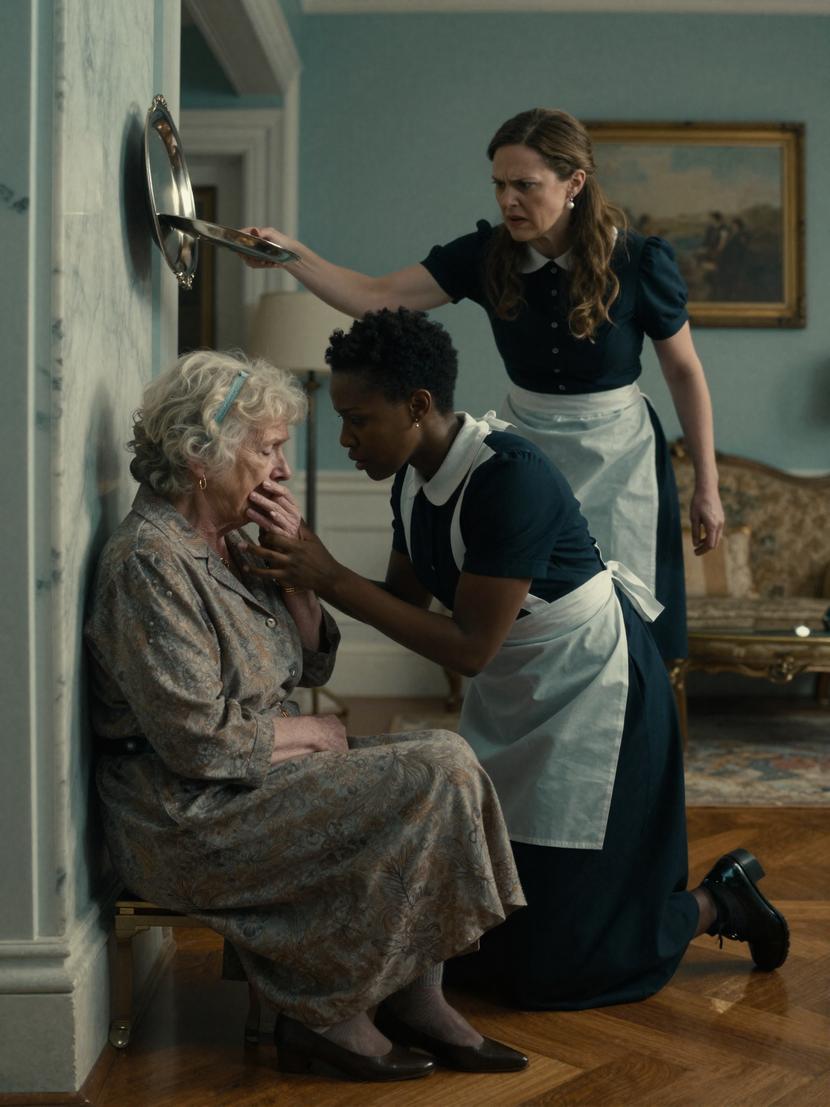 His mother, gasping feebly, pale and frightened; his fiancée, wild-eyed and unhinged, poised mid-strike; and the young Black maid holding Edith as if her life depended on it.