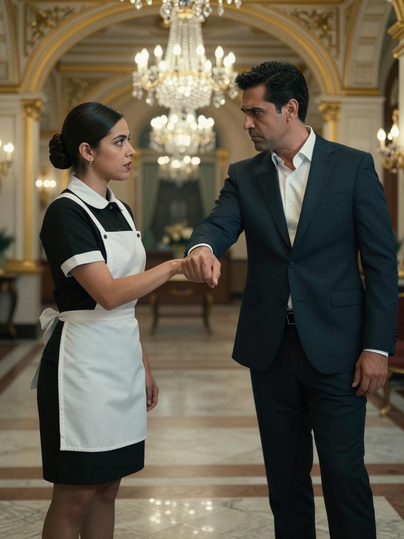 By the side of a table stacked with crystal flutes, she stood steady despite the tightening of her chest. A silver tray balanced in her hands, fingers firm. Her uniform was immaculate—the black fabric crisply pressed, the white apron untouched by a single smudge. Her dark hair was swept back flawlessly, not a stray strand daring to escape. All evening she had remained invisible, afloat on the periphery of opulent conversations she was never meant to intrude upon.