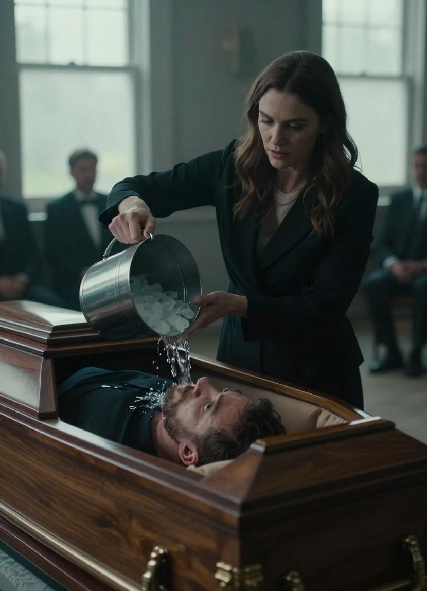 When the moment came for her final farewell, tears did not fall. Instead, Maya carried a bucket of ice-cold water she had secretly prepared. With unwavering resolve, she knelt beside the coffin and poured the freezing liquid over Ethan’s face.