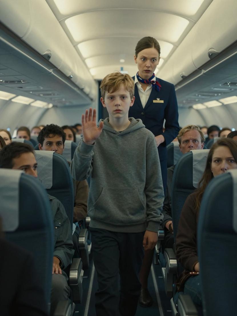 The flight attendant turns to the boy, tears carving silent paths down her cheeks.